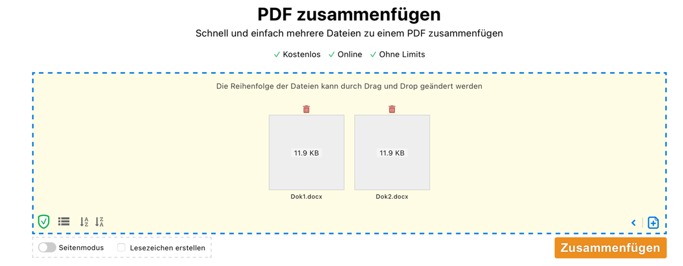 Du kannst alternativ bei PDF24.org deine PDF zusammenfügen, wenn du kein zusätzliches Programm herunterladen möchtest. Im Vergleich zur Software ist der Ablauf sogar noch einfacher, du kannst allerdings zum Beispiel keine einzelnen Seiten löschen. Du kannst die PDF-Dokumente direkt über deinen Speicherplatz auswählen oder über die Schaltfläche in das Fenster ziehen. Der Upload der Dateien startet automatisch. Die Reihenfolge lässt sich anschließend wie gewohnt ändern. Mit einem Klick auf Zusammenfügen schließt du den Vorgang ab.
