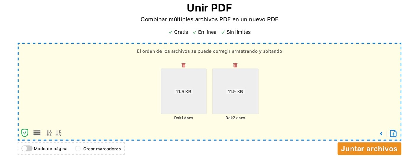 Alternativamente, puede fusionar su PDF en PDF24.org si no desea descargar un programa adicional. En comparación con el software, el proceso es aún más fácil, pero no puede eliminar páginas individuales. Puede seleccionar los documentos PDF directamente desde su ordenador o arrastrarlos a la ventana usando el botón. La carga de los archivos se inicia automáticamente. A continuación, puede cambiar el orden como de costumbre. Haga clic en Fusionar para completar el proceso.