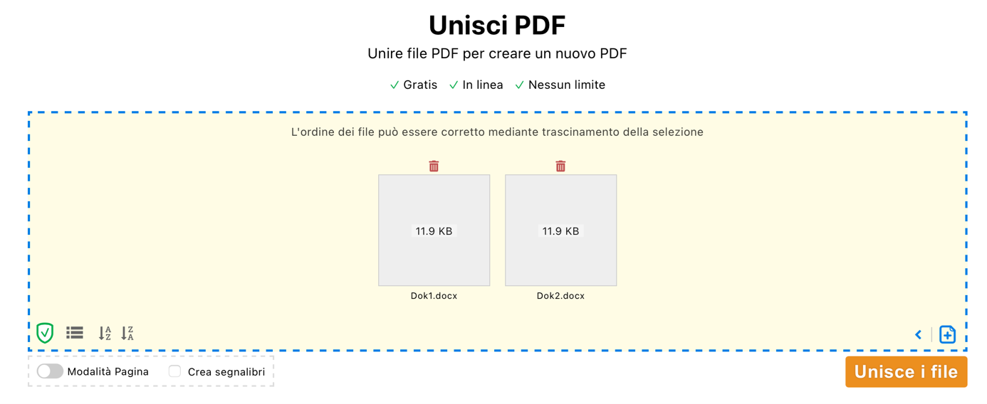 In alternativa puoi unire il tuo PDF su PDF24.org se non vuoi scaricare un programma aggiuntivo. Rispetto al software, il processo è ancora più semplice, ma non è possibile eliminare singole pagine, ad esempio. Puoi selezionare i documenti PDF direttamente dal tuo spazio di archiviazione o trascinarli nella finestra utilizzando il pulsante. Il caricamento dei file si avvia automaticamente. È quindi possibile modificare l'ordine come al solito. Fare clic su Unisci per completare il processo.