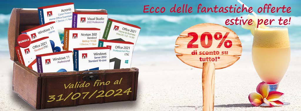 Da ora fino al 31 luglio 2024, hai la possibilità di acquistare il tuo software preferito a prezzi imbattibili. Che tu stia cercando pacchetti per l'ufficio, sistemi operativi o software di sicurezza, troverai ottimi prodotti in ogni categoria della nostra intera gamma, tutti con uno sconto estivo del 20% . Questo significa più risparmi mentre porti la tua produttività al livello successivo!